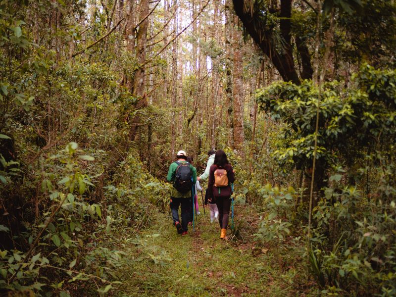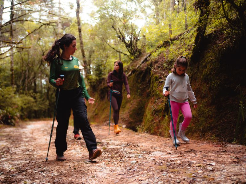 A trilha tem cerca de 2km, com ritmo tranquilo e desnível suave, permitindo que crianças e adultos caminhem com conforto. O percurso acontece em meio à mata, com clima de montanha e contato direto com ambiente natural, estimulando a curiosidade e o espírito de aventura dos pequenos.